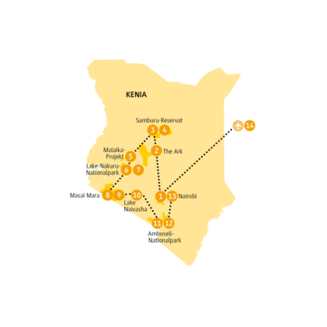 <Wenn es das Glück zulässt, erspähst du bereits in aller Frühe durstige Vierbeiner am Wasserloch, welches wie ein Magnet Tiere jeder Art anzieht. Genieße die sich dir bietenden Bilder, bevor die Reise weitergeht. Nach dem Frühstück passierst du den Mount Kenya National Park, aus dem der gleichnamige zweithöchste Berg des Landes ragt. Etwas weiter nördlich verläuft der Äquator, der die Welt in Nord- und Südhalbkugel teilt. Du machst natürlich einen kurzen Stopp und vielleicht schaffst du es sogar auf beiden Seiten der Erde gleichzeitig zu stehen, bevor es gen Norden weiter in das Samburu Game Reserve geht. Gut gestärkt erkundest du nachmittags den Park, der als einer der schönsten im ganzen Land bezeichnet wird. Die einheimischen Samburu sagen immer: »Die Tiere im Norden sind die schönsten«. Ob das wohl stimmt? Davon kannst du dir selbst ein Bild machen.