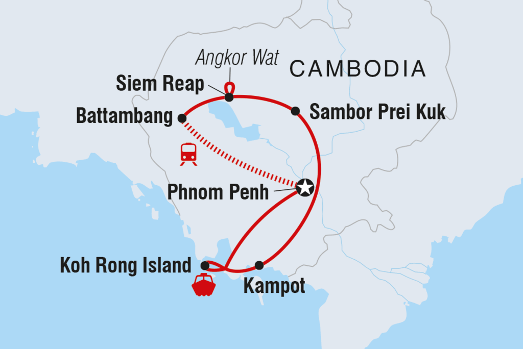 Erlebe das Beste von Kambodscha auf einer umfassenden zweiwöchigen Reise mitten ins Herz des Landes. Lerne die Menschen, die Landschaft, die Bräuche und die Küche kennen, von der Hauptstadt Phnom Penh bis zum ländlichen Dorf Sambor Prei Kuk. Erlebe die französische Eleganz von Battambang und sieh dir die altehrwürdige Pracht von Angkor Wat - einer UNESCO-Weltkulturerbestätte - bei Sonnenaufgang an. Besuche den abgelegenen Süden und entdecke das Land der Khmer, bevor du für zwei Tage auf die Insel Koh Rong fährst, wo du einen herrlichen Strandurlaub genießen kannst. Wenn du die besten Sehenswürdigkeiten Kambodschas mit einem einheimischen Reiseleiter sehen willst, der alle Geheimnisse kennt, ist diese Reise genau das Richtige für dich.