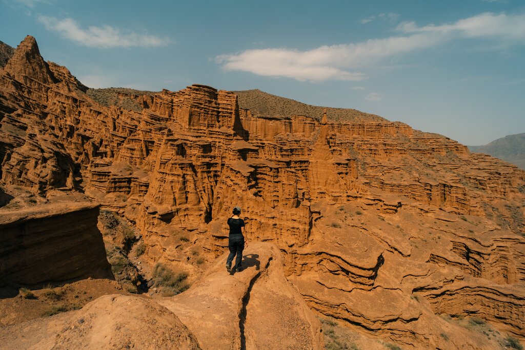 <Wir setzen unsere Fahrt nach Osten fort und besichtigen unterwegs in der Gegend der historischen Stadt Balasaghun den Burana-Turm, ein mittelalterliches Minarett aus der Zeit der Karakhaniden. Anschließend geht es weiter zur Schlucht von Kok-Moinok, wo wir eine Wanderung in einer Welt aus beeindruckenden Sandsteinformationen unternehmen. Im nahe gelegenen Ort Kochkor übernachten wir in einem einfachen Gästehaus.