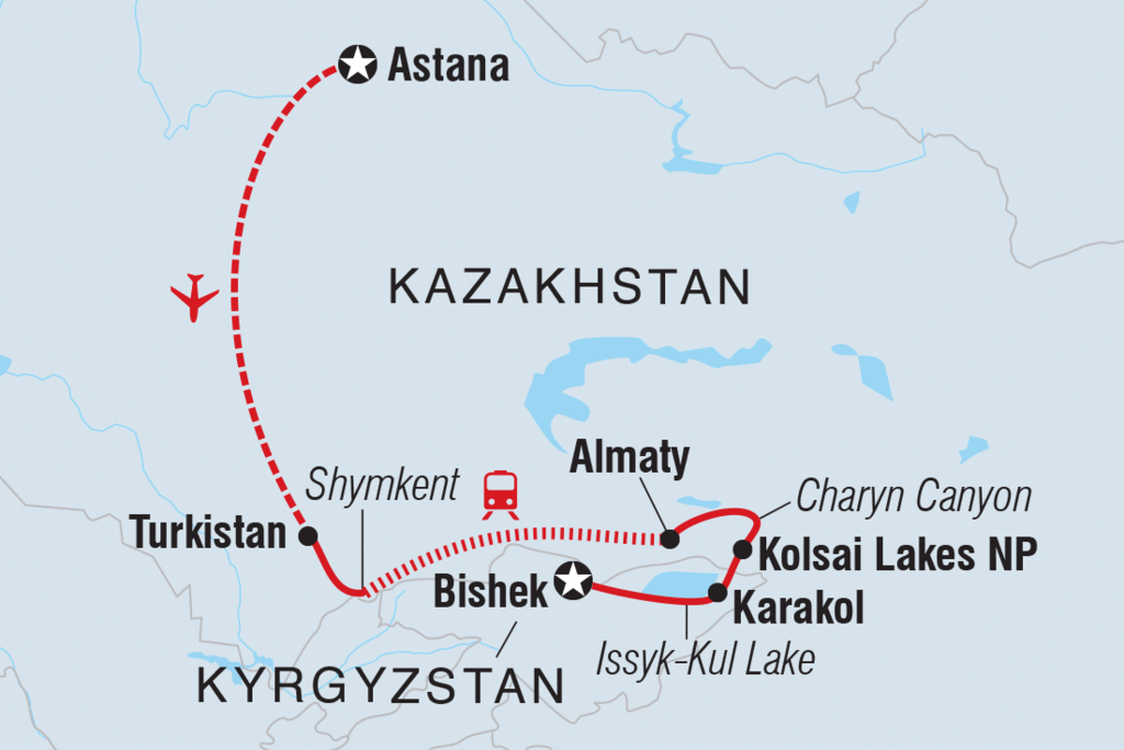 Auf dieser 11-tägigen Reise von Astana nach Bischkek erlebst du den Kontrast zwischen dem Futuristischen und dem Antiken. Du wirst sehen, wie sich die zentralasiatische Landschaft von der Weite des flachen Landes zu kurvenreichen Bergstraßen verändert. Besuche die Ruinen der Seidenstraße in Otrar, bewundere das großartige Mausoleum von Yasaui, erkunde die Denkmäler von Astana (die dich vielleicht an Star Trek erinnern) und schlendere durch die kulturelle Hauptstadt Almaty. Wandere zu den unglaublichen Kolsai-Seen, um versunkene Wälder, tiefe Schluchten und Täler zu sehen, und mach eine malerische Bootsfahrt auf dem alpinen Issky-kul-See, bevor du im charmanten Bischkek ankommst.