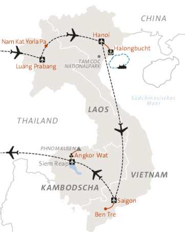 Auf dieser Reise entdecken Sie Laos, Vietnam und Kambodscha – Länder voller faszinierender Landschaften, reicher Kultur und gastfreundlicher Menschen. Vom ruhigen Mekong in Luang Prabang über die Wasserwege des Mekong-Deltas, die lebendigen Straßen Hanois und Saigons bis zur Halong Bucht, die Sie auf einem Segelboot erkunden, erleben Sie unvergessliche Szenen. Radtouren durch Reisfelder, Bootsfahrten, Begegnungen mit Einheimischen und der Besuch historischer Bauwerke wie Angkor Wat lassen Sie tief in das tägliche Leben und die Geschichte dieser drei Länder eintauchen.