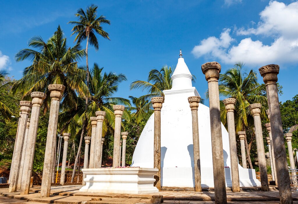 <Am Morgen besuchen wir den heiligen Berg Mihintale, wo im 3. Jh. v. Chr. der Buddhismus nach Sri Lanka kam. Vom Felsen reicht der Blick weit über den grünen Regenwald und imposante Bergketten. Mönche meditieren hier jeden Morgen – wer möchte, darf sich anschließen. Nach einem späten Frühstück im Hotel besichtigen wir Anuradhapura mit dem kunstvollen Mondstein und der imposanten Buddha-Statue. Den Abend krönt ein landestypisches Street-Food-Dinner am See.