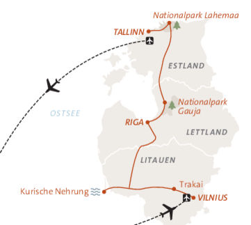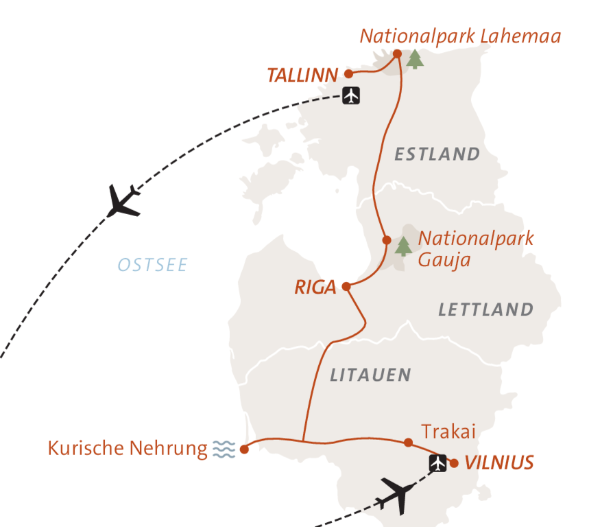 Drei Länder, drei Kulturen, drei Geschichten – und doch ein gemeinsamer Klang: das Baltikum. Auf unserer Reise erkunden wir das Land der Burgen, Seen, Bäche und Moore auf abwechslungsreichen Wanderwegen und idyllischen Küstenpfaden. Wir durchstreifen die schönsten Nationalparks, darunter den Gauja und den Lahemaa, und lassen uns von den mittelalterlichen Städten Vilnius, Riga und Tallinn in vergangene Zeiten entführen. Mächtige Burgen, malerische Fischerdörfer sowie die eindrucksvollen Dünen und Strände der Kurischen Nehrung machen diese Reise zu einem besonderen Erlebnis. Dank des milden Klimas eignen sich die drei baltischen Staaten ideal, um ihre einzigartige Natur und Kultur zu Fuß zu entdecken.