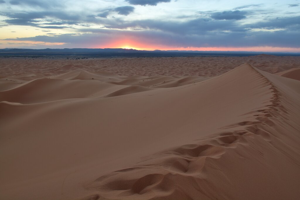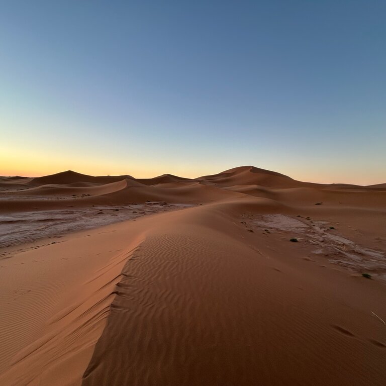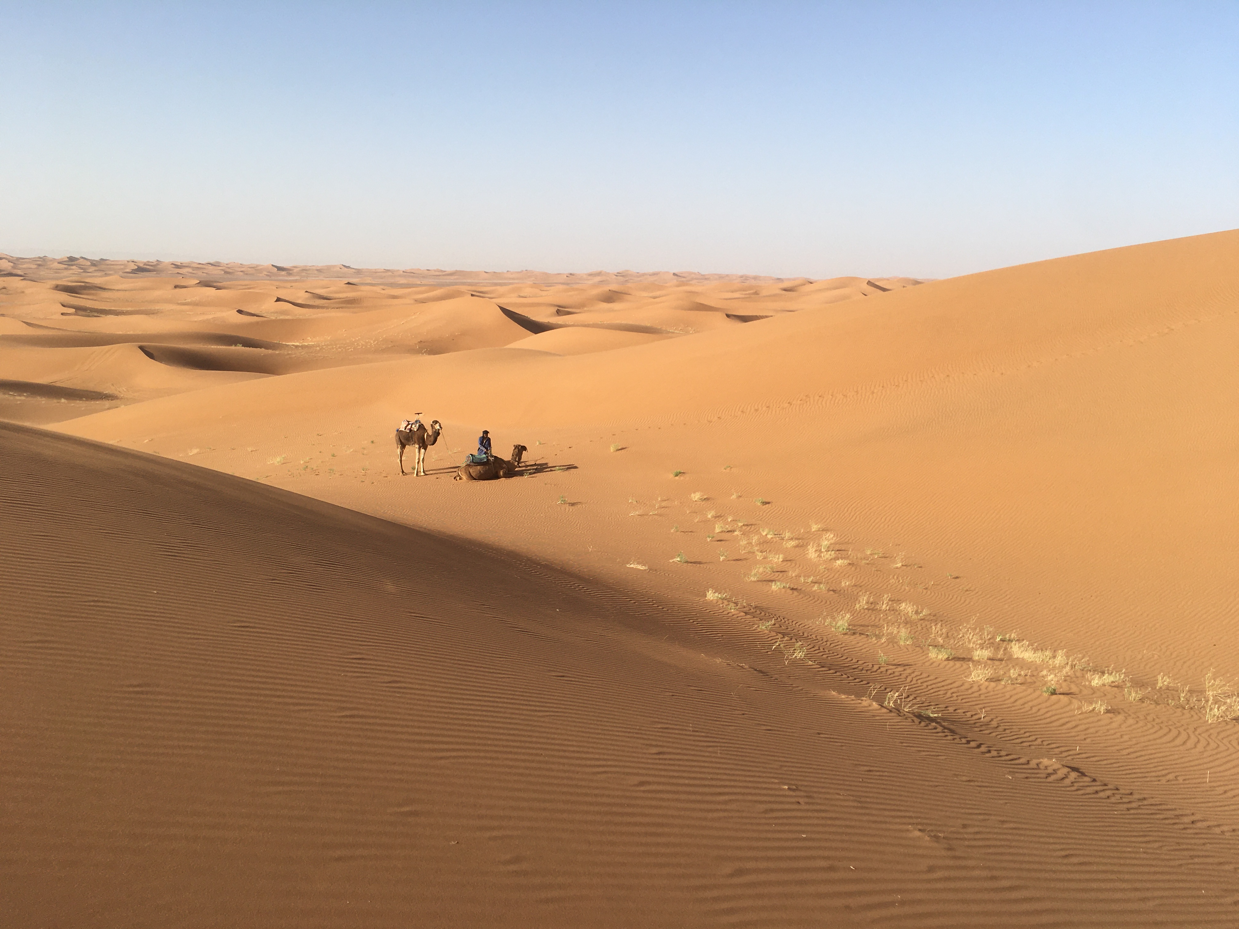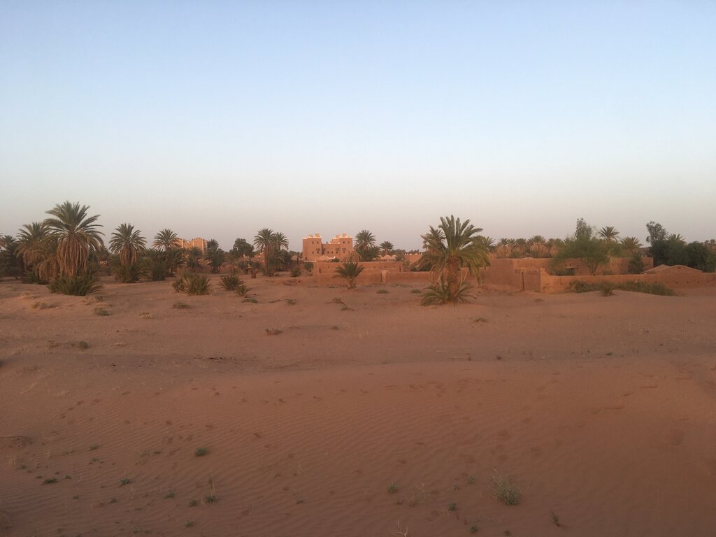 <Ihr verbringt einen entspannten Morgen unter den Dattelpalmen und am Pool und bereitet Euch auf den Wüstenausflug vor. Von Zagora aus geht es bis zum Rand der Sahara nach M’hamid, dem Tor zur Wüste. Mit dem 4x4 geht es über Sanddünen ca.1,5 Std. bis zum Wüstencamp inmitten der Dünen. Kamelritt am Nachmittag (optional) Sonnenuntergang auf einer der riesigen Sanddünen inklusive. Funkelnde Sterne am Wüstenhimmel machen die Nächte in der Wüste unvergesslich.