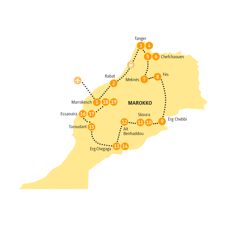 - 18 Übernachtungen in Hotels und Gästehäusern (Riads) sowie in einem komfortablen Zeltcamp in der Sahara