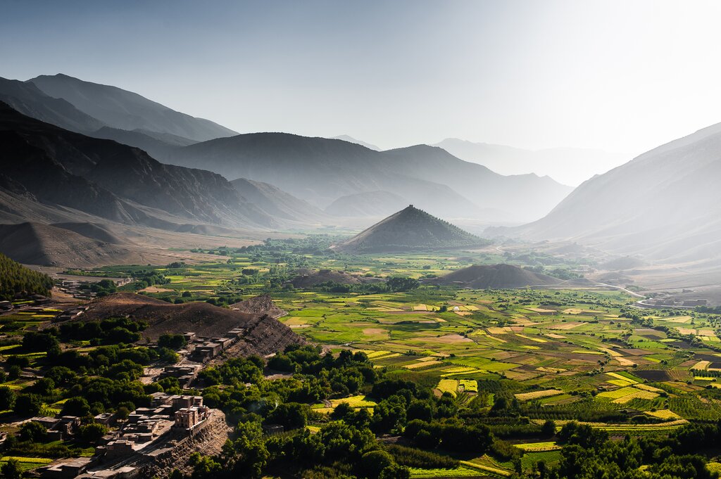 grüne Täler und trockene Berge mit Hängen, die mit Walnussbäumen und Wacholder bepflanzt sind.