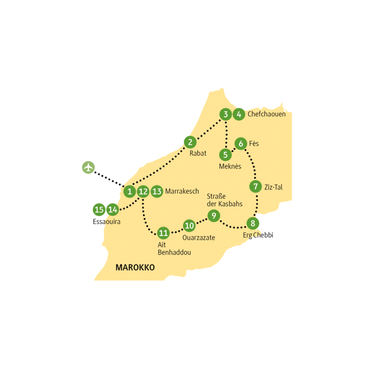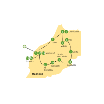 <Marrakesch, auch die »rote Stadt« genannt, heißt dich am Vormittag willkommen. Du unternimmst zunächst eine Erkundungstour durch die Medina, die von einer zwölf Kilometer langen Stadtmauer umgeben ist. Dein Weg führt dich zum Bahia-Palast mit seinem mosaikverzierten Innenhof und zu den prachtvollen Saadier-Gräbern. Die etwa 500 Jahre alte Nekropole wird ebenfalls von Mosaiken, Stuck und Zedernholz geziert. Sieben Sultane und ihre Angehörigen finden hier ihre letzte Ruhe. Architektonisches Wahrzeichen der Stadt ist das 70 Meter hohe Minarett der Koutoubia-Moschee, die wiederum in unmittelbare Nähe zum berühmten Djemaa-El-Fna-Platz liegt. Der Platz ist das Herz der Medina und verändert im Tagesablauf sein Gesicht. Davon kannst du dich in ein paar Tagen selbst überzeugen. Nun ist es jedoch Zeit die Reise fortzusetzen. Es geht weiter nach Casablanca, um der berühmten Hassan-II.-Moschee einen Besuch abzustatten. Die moderne Moschee ist nicht nur das größte Gotteshaus des Landes, sondern auch eine der größten Moscheen der Welt. Der große Vorplatz, das gigantische Minarett und der Atlantik im Hintergrund sind definitiv ein Erinnerungsfoto wert. Etwa 100 Kilometer weiter nördlich liegt hier heutiges Tagesziel Rabat, Landeshauptstadt und aktueller Königssitz.
