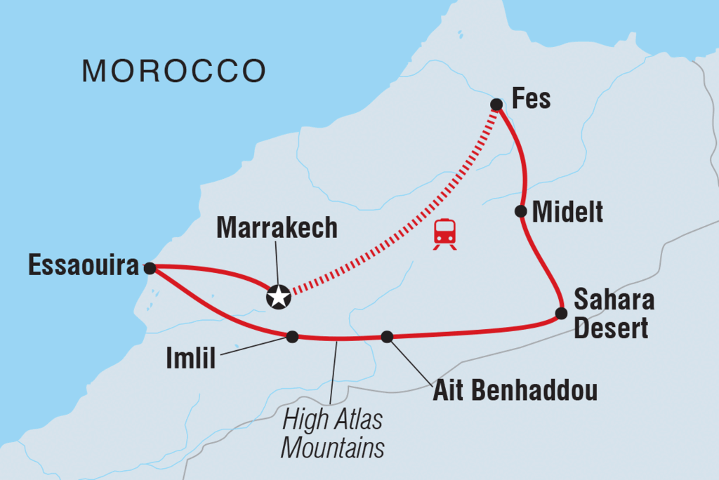 <Salaam Alaikum! Willkommen in Marokko. Dein Abenteuer beginnt im pulsierenden Marrakesch mit einem Willkommenstreffen um 17 Uhr. Danach besuchst du gemeinsam mit deinem Reiseleiter und deinen Mitreisenden den Djemaa el-Fnaa in der Altstadt, während die Sonne untergeht, und genießt ein lokales Straßenessen. Der Djemaa el-Fnaa ist der größte öffentliche Platz der Welt und hat fast die Atmosphäre eines mittelalterlichen Jahrmarkts - die Kinder werden es also lieben! Straßenkünstler wetteifern darum, dich zu unterhalten, und die köstlichen Gerüche ziehen vorbei, wenn die Essensstände ihre lokalen Köstlichkeiten zubereiten - du wirst zweifellos so viel wie möglich für dein Abendessen probieren wollen! Du kannst auch ein paar Snacks für die morgige Zugfahrt kaufen.