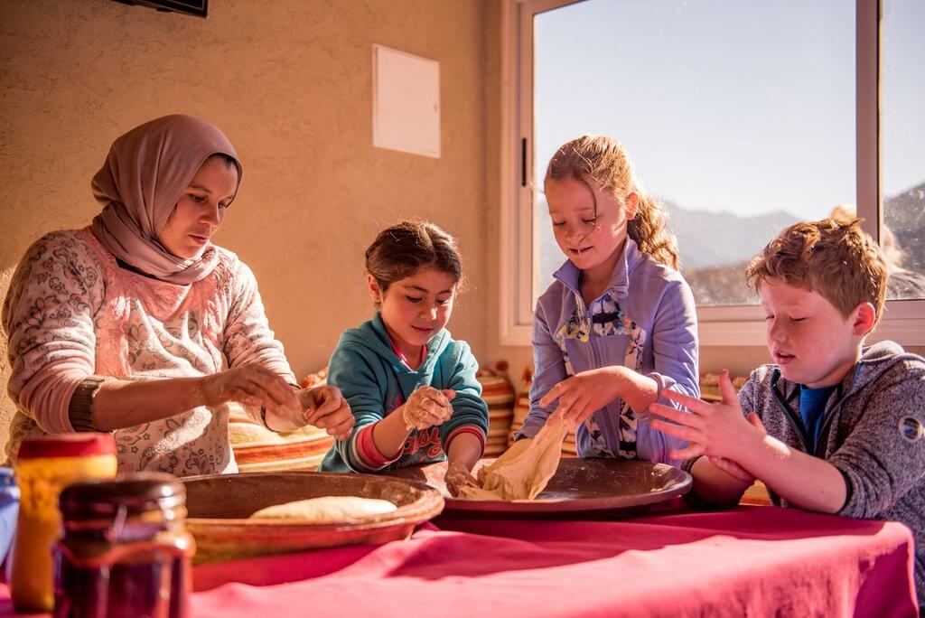 <Heute Morgen gibt es zum Frühstück eine Brotbackvorführung und vielleicht einen frühmorgendlichen Spaziergang durch das Dorf Imlil. Auf dem Weg nach Taroudant fährst du durch einige Amazigh-Dörfer und überquerst das Hochgebirge über den Tizi n Tast, von dem aus du einen tollen Blick auf die größte Ebene von Sous hast. Wenn du am späten Nachmittag in deiner Unterkunft ankommst, kannst du mit den Kindern im Pool schwimmen gehen und einen entspannten Abend verbringen.