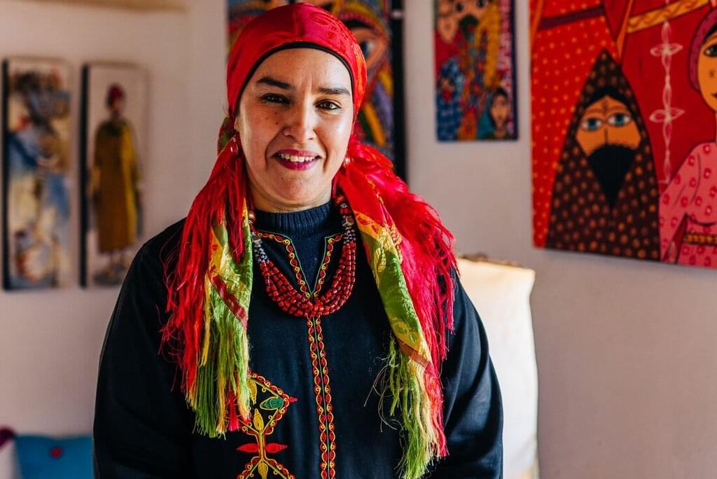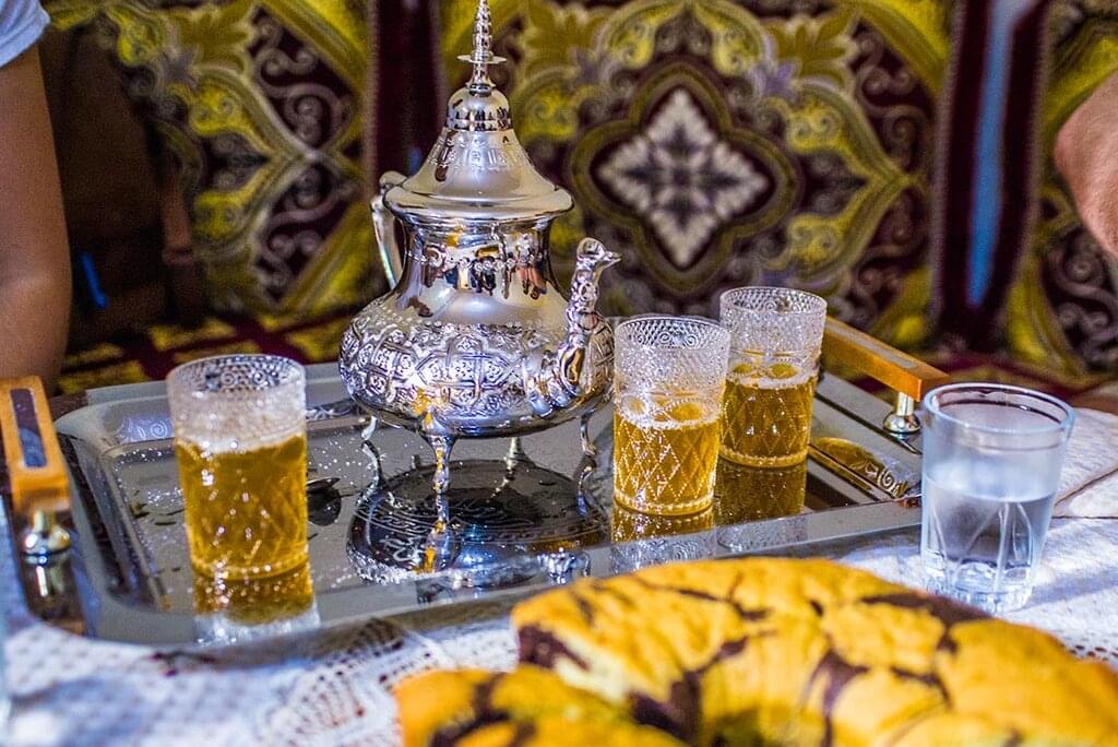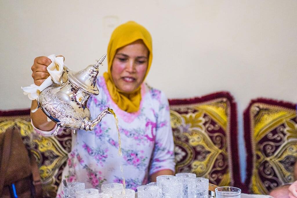 <Steig in deinen Privattransporter und mach dich auf die Fahrt zum Dorf Bou Tharar gefasst. Hier wirst du von einheimischen Frauen bewirtet und es gibt Amazigh-Musik und einheimische Lieder sowie ein leckeres, traditionelles Essen, wenn du ankommst. Du übernachtest heute in einer wunderschönen Terrakotta-Gite (ländliches Gästehaus). Von hier aus hast du einen herrlichen Blick auf die umliegenden Hügel und wirst von der einheimischen Familie, die das Haus betreibt, mit herzlicher Gastfreundschaft willkommen geheißen.