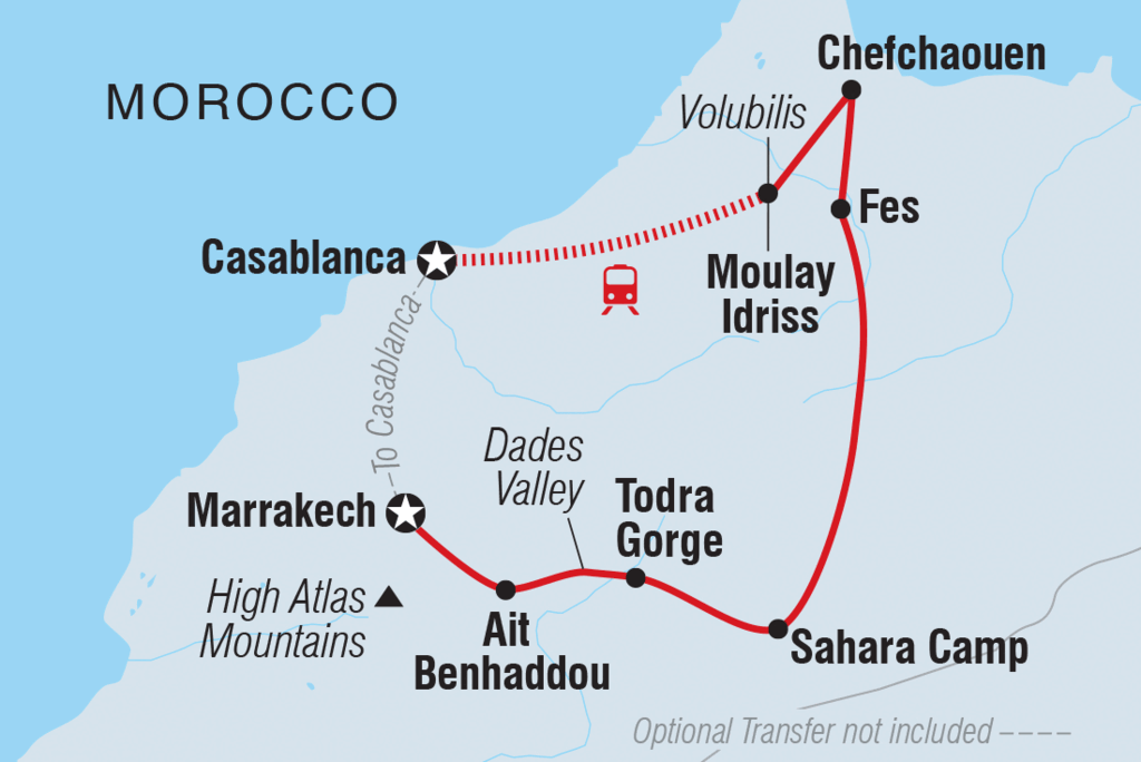 Es ist sehr wichtig, dass du am Begrüßungstreffen teilnimmst, da wir bei dieser Gelegenheit die Versicherungsdaten und Informationen über die nächsten Angehörigen sammeln werden. Wenn du dich verspäten solltest, gib bitte deinem Reisebüro oder der Hotelrezeption Bescheid. Frag an der Rezeption nach oder halte Ausschau nach einem Zettel in der Lobby, um zu erfahren, wo das Treffen stattfinden wird. Bitte beachte, dass einige unserer Reisenden in Casablanca von Einheimischen angesprochen werden, die ihnen Ausflüge anbieten, bevor sie ihre Reise antreten. Dies ist vor allem in und um die Hotels, die von Intrepid genutzt werden, der Fall. Diese Reiseleiter stehen in keiner Weise mit Intrepid Travel in Verbindung und wir können nicht für die Sicherheit oder die Qualitätsstandards ihrer Touren garantieren. Wir raten unseren Kunden dringend davon ab, an einer Tour teilzunehmen, die von nicht autorisierten Reiseleitern angeboten wird. -