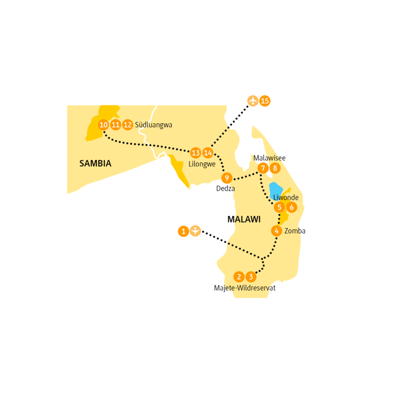 Ist Malawi sehenswert? Unbedingt. Voller Tierwunder? Absolut. Herzlich? Aber hallo! Und dass es nicht auf allen Listen ganz oben steht, ist ein Grund mehr, es jetzt zu erleben. Denn hier im Ostafrikanischen Grabenbruch werden alle Herzklopf-Rekorde gebrochen. Auf den Safaris im Jeep und zu Fuß oder dem Blick auf die abendlichen Farbwunder am Malawisee. Und der Abstecher in den berühmtesten Nationalpark Sambias lohnt sich auch.