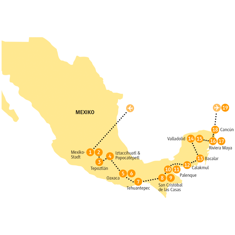 Heute beginnt er endlich, dein Traumurlaub in Mexiko! Nach der Ankunft in Mexiko-Stadt wirst du von deiner Reiseleitung am Flughafen empfangen und in dein Hotel gebracht. Nach dem langen Flug heißt es nun: Beine hoch und das Ankommen genießen.