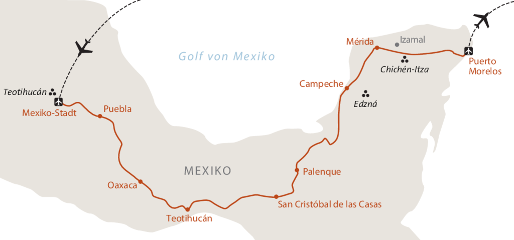 Die Reise startet in Mexiko Stadt und endet in Cancún.