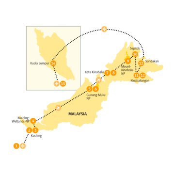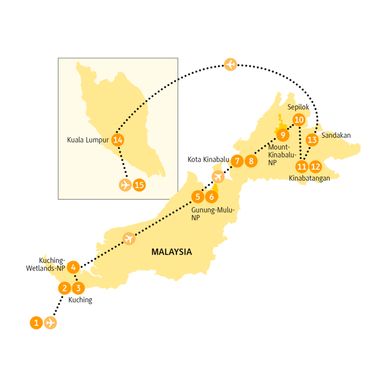 - Inlandsflüge mit Malaysia Airlines von Kuching nach Mulu, von Mulu nach Kota Kinabalu und von Sandakan nach Kuala Lumpur