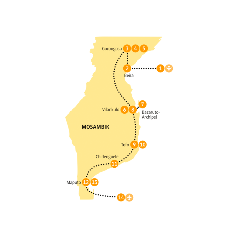 <Heute und in den kommenden Tagen steht bereits ein großes Highlight deiner Reise auf dem Programm, wie von National Geographic als »Africa’s Lost Eden« betitelt: Wir fahren zum Gorongosa-Nationalpark. Auf holpriger Straße geht es landeinwärts in nördliche Richtung. »Afrikanische Massage« nennt sich das. Der Park liegt im Herzen von Zentralmosambik am südlichen Ende des Großen Afrikanischen Grabenbruchs. Er ist etwa 3.770 Quadratkilometer groß und besteht aus typischer Buschlandschaft, Flusstälern, Hochebenen und Bergen, die mit tropischem Regenwald bewachsen sind. Gorongosa beheimatet eine erstaunliche Vielfalt an Tieren und Pflanzen, von denen einige endemisch und somit sonst nirgendwo auf der Welt zu finden sind. Ein Hotspot auf der Wanderroute von Zugvögeln. Viele der Tierbestände des Parks wurden durch jahrzehntelange Bürgerkriege und Wilderei stark reduziert. Dank effektiven Parkmanagements und der Wiederansiedlung wichtiger Arten sind die Wildtierpopulationen heute zurück auf dem natürlichen Niveau und man kann den Park in seiner ursprünglichen Pracht erleben. Nach der Ankunft in Chitengo erwartet dich am Nachmittag auch schon die erste dreistündige Safari im offenen Geländewagen.