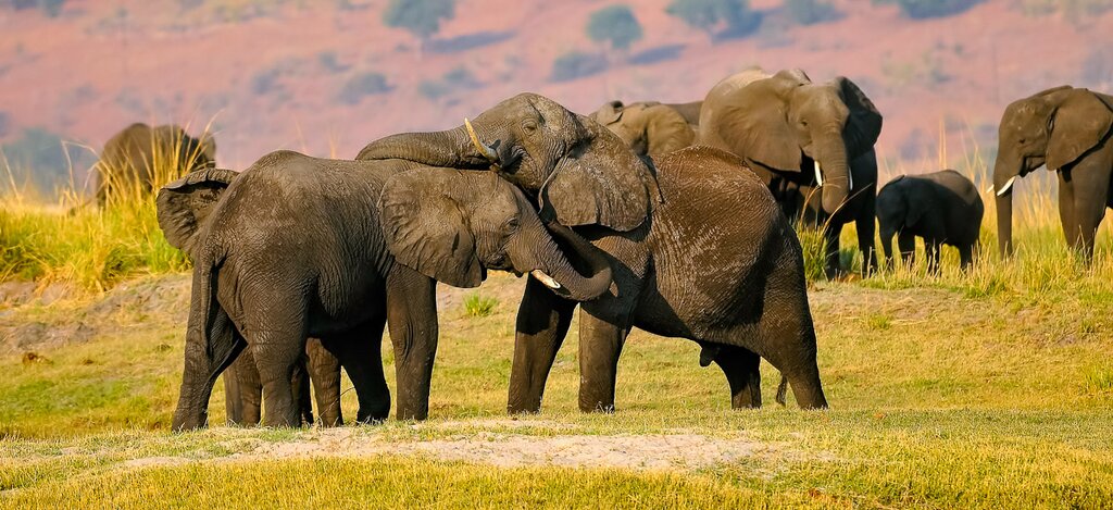 <Zeit für die erste Safari. Der Chobe-Nationalpark beherbergt die ganze Artenvielfalt der afrikanischen Tierwelt. Auf einer geführten Safari im offenen Geländewagen kommst du den Tieren besonders nahe, die nicht so häufig direkt an den Chobe-Fluss kommen. Gerade vormittags grasen die meisten Tiere, daher sind die Möglichkeiten für Tierbeobachtungen an Land optimal. Löwen und andere Raubkatzen, die sich gern im Schatten der Büsche aufhalten, sind ebenfalls besser zu sehen. Mittags liegen die Tiere faul im Schatten – und du in deiner Unterkunft. Für den Nachmittag steht eine ca. dreistündige Bootsfahrt an. Dank der offenen Flusslandschaft wirst du mit großer Wahrscheinlichkeit Elefanten, Flusspferde und Krokodile entdecken. Auch viele Antilopen finden sich zu einem Drink am Ufer ein. Ein besonderes Schauspiel: die badenden Elefanten im Fluss.