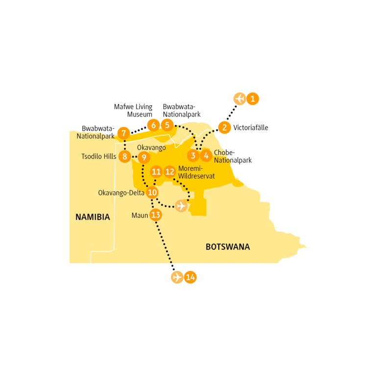 Wasserscheu solltest du auf dieser Reise besser nicht sein. Geht ja schon gut los mit den 10 Millionen Litern der Victoria Falls. Pro Sekunde, wohlgemerkt. Und wenn den Elefanten das Wasser bis zum Hals steht, bist du bereits im Chobe-Nationalpark. Trotzdem nur eine Pfütze gegenüber den Wasserläufen, Lagunen und schwimmenden Inseln im Okavango-Delta. 20.000 qm Weltnaturerbe, übervoll mit Pflanzen und Tieren. Am schönsten trockenen Fußes bei einem Rundflug über das Paradies.