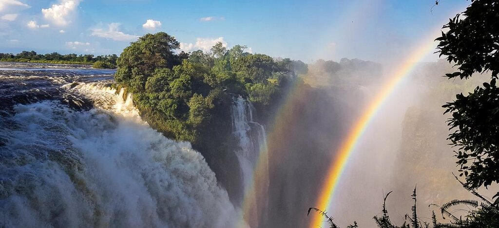 <Es geht direkt los mit den legendären Victoriafällen und du beobachtest, wie sich der Sambesi mit tosendem Lärm über 100 Meter in die Tiefe stürzt. Auf einem Rundwanderweg eröffnen sich dir immer wieder neue Perspektiven und Fotomotive. Der Wassersprühnebel spritzt bis zu 200 Meter in die Höhe und ist noch aus weiter Ferne zu sehen. Deshalb nennen die Einheimischen die Wasserfälle Mosi-oa-Tunya, was so viel wie »donnernder Rauch« bedeutet. Das UNESCO-Weltnaturerbe ist umgeben von tropischem Regenwald, einem wahren Naturparadies, dessen Lebensgrundlage die Feuchtigkeit der immerwährenden Gischt ist.