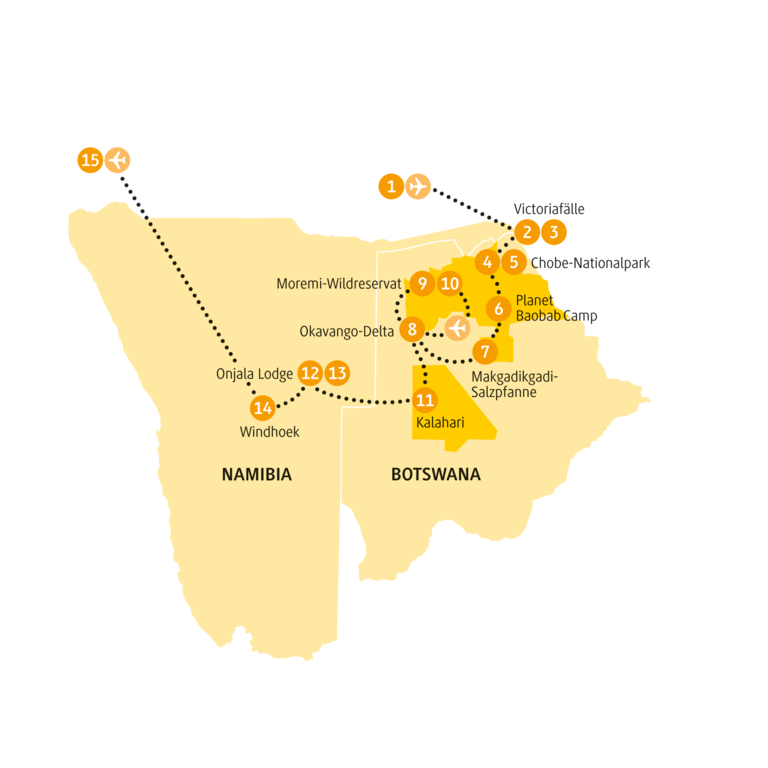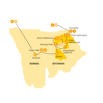 - 4 Safaris im offenen Geländewagen: 1 im Chobe-NP, 2 im Moremi-Wildreservat und 1 im Wildpark der Onjala Lodge; 2 Safaris per Boot: 1 im Chobe-NP und 1 im Moremi-Wildreservat; 1 Safari zu Fuß im Wildpark der Onjala Lodge