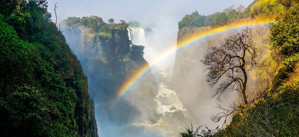 <Es geht direkt los mit einem von vielen Highlights deiner Reise. Du besuchst die berühmten Victoriafälle und beobachtest, wie der Sambesi sich mit tosendem Lärm über 100 Meter in die Tiefe stürzt. Auf einem Rundwanderweg eröffnen sich dir immer wieder neue Perspektiven und Fotomotive. Der Wassersprühnebel steigt bis zu 200 Meter in die Höhe und ist noch in weiter Entfernung zu sehen, weshalb die Wasserfälle von den Einheimischen Mosi-oa-Tunya genannt werden, was so viel wie »donnernder Rauch« bedeutet. Das UNESCO-Weltnaturerbe ist umgeben von tropischem Regenwald, ein wahres Naturparadies, das durch die Feuchtigkeit der immerwährenden Gischt existieren kann.
