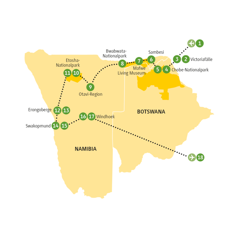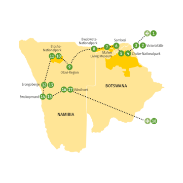 - 2 Safaris im Etosha-NP, 1 Safari im Bwabwata-NP; 2 Safaris im offenen Geländewagen: 1 im Chobe-NP und 1 auf dem Gelände der Hohenstein Lodge; 3 Safaris per Boot: 1 auf dem Chobe, 1 auf dem Sambesi und 1 auf dem Okavango; 1 Safari zu Fuß auf dem Gelände der Hohenstein Lodge