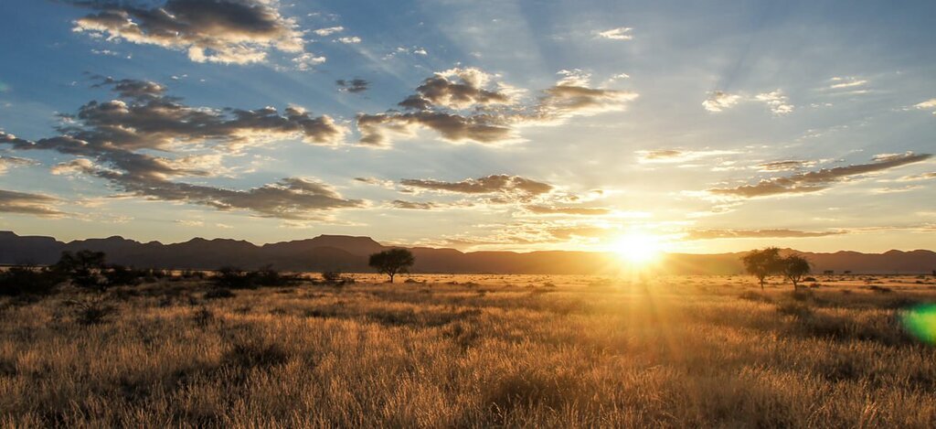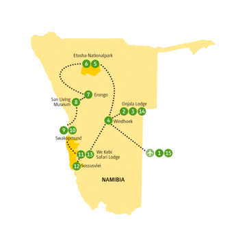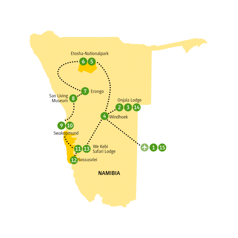 <Deine Reiseleitung nimmt dich am Flughafen von Windhoek in Empfang und bringt dich zu deiner Unterkunft. Die reizvolle Landschaft, die gastfreundliche Atmosphäre und die gute Küche bilden den idealen Rahmen, um sich vom Flug zu erholen. Schon am Nachmittag fährst du durch den Wildpark und machst dich im offenen Geländewagen etwa zwei Stunden auf die Suche nach Oryxantilopen, Springböcken und Straußen. Den spektakulären Sonnenuntergang gibt es inklusive.