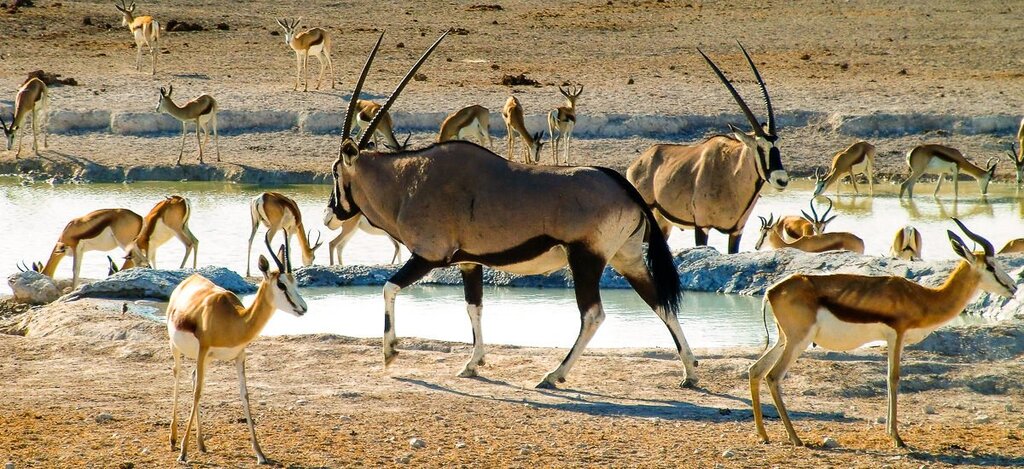 <Den heutigen Tag verbringst du ganz im Etosha-Nationalpark. Du steuerst Wasserstellen mit geheimnisvoll klingenden Namen wie Gemsbokvlakte und Olifantsbad an. Diese sind besonders bei Antilopen und Elefanten beliebt, die sich hier zum Fotoshooting einfinden. Etosha ist auch für seine zahlreichen Antilopenarten berühmt. Vielleicht triffst du auch das Eland und das Damara-Dikdik, die größte und die kleinste Art.