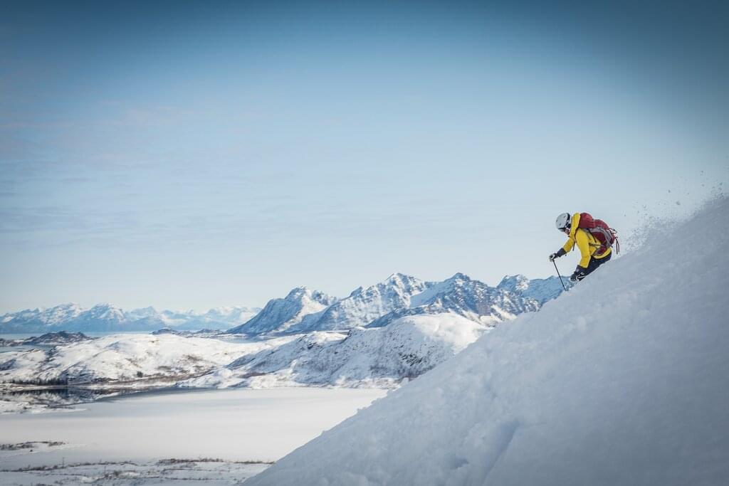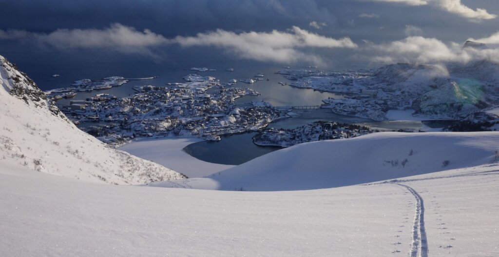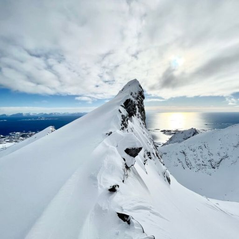 <Elegante Tour auf den Gipfel Varden, die landschaftlich beeindruckend ist und einen grandiosen Rundblick bietet. Mit rund 1.000 hm im Aufstieg und 2 variantenreichen Abfahrten ist sie ein Skitourenklassiker auf den Lofoten. Wir runden den Tag mit dem Besuch der charmanten Hafenstadt Henningsvær ab, die mit ihren malerischen Gassen und historischen Gebäuden begeistert und einen faszinierenden Einblick in das Leben auf den Lofoten bietet.