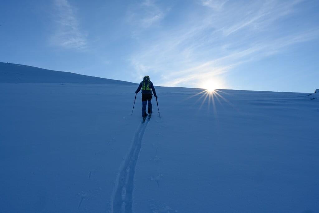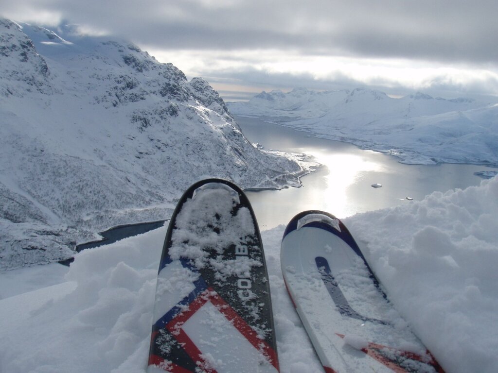 <Unsere Eingehtour ist ein einfacher, aber landschaftlich beeindruckender Berg mit Blicken über die umliegenden Berge und Fjorde. Die Abfahrt bietet eine technisch einfache, schöne Flanke, auf der wir das skifahrerische Können im Auf- und Abstieg gut überprüfen können. Wer noch nicht genug hat, kann noch einen weiteren Gipfel besteigen, den Pilan (755), ebenfalls technisch einfach, aber mit einer genialen Rundumsicht. Es sind zusätzlich noch 200 HM.
