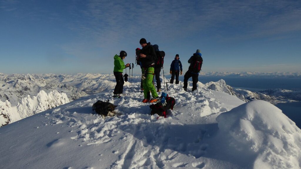 <Wir fahren heute in den Norden der Insel Vagen und machen uns auf zum Gipfelplateau des Rundfjellet. Nach einem Aufstieg von 600 Höhenmetern erreichen wir das Gipfelplateau. Wir haben die Qual der Wahl für zahlreiche Abfahrtsmöglichkeiten.