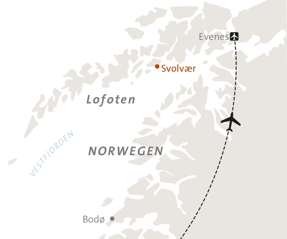 Solltest du den Flug nicht über ASI Reisen gebucht haben, kannst du den Flughafentransfer in Norwegen bei An- und Abreise trotzdem in Anspruch nehmen. Wir benötigen dazu bestimmte Informationen zu deinem Flug im Voraus. Dazu gehören die genauen Flugzeiten und die Flugnummer. Wichtig: bitte buche deine Flüge passend zu den Transferzeit am An- und Abreisetag. Abfahrt am Anreisetag gegen 17h30 (späteste Ankunft am Flughafen Evenes um 16h30), Abfahrt am Abreisetag passend zu den Abflügen ab 12h00. Die Uhrzeiten können variieren, da sie den jeweiligen Ankünften angepasst werden. Die Fahrt vom/zum Flughafen dauert ca. 3 Stunden. Du wirst vor deinem Reiseantritt eine E-Mail von uns erhalten, in der wir dich bitten, uns diese Details mitzuteilen.