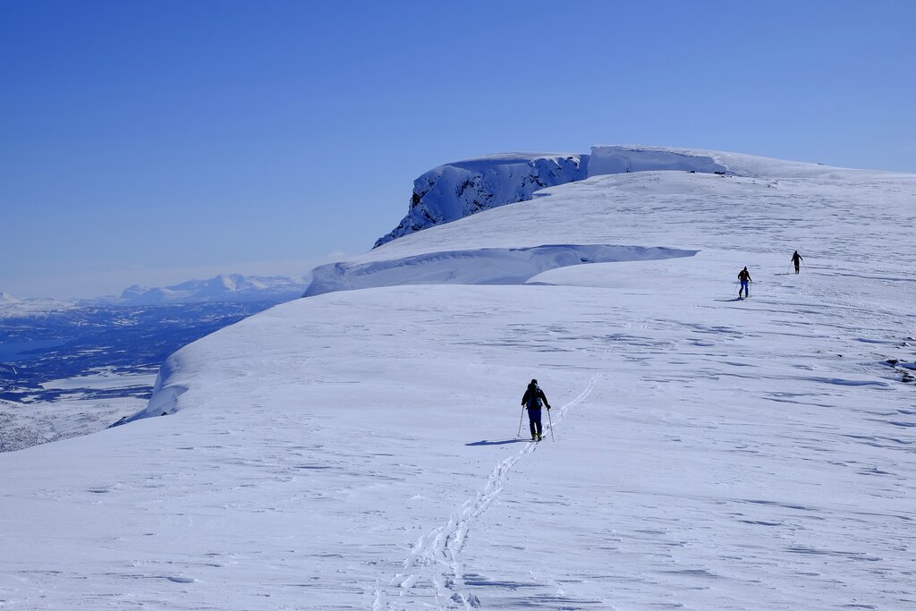 <Heute fahren wir auf das beeindruckende Hochplateau von Kaperdalen. Hier erwartet uns eine Fülle an unberührten Gipfeln, die darauf warten, erkundet zu werden! Das Hochplateau bietet ideale Bedingungen für eine Rundtour, die wir flexibel nach den Gegebenheiten vor Ort und unseren Wünschen gestalten können. Die Routen sind abwechslungsreich und spektakulär und bei den Abfahrten ist an diesem Tag vom Pulverschnee bis zu feinstem Firn ist alles möglich.