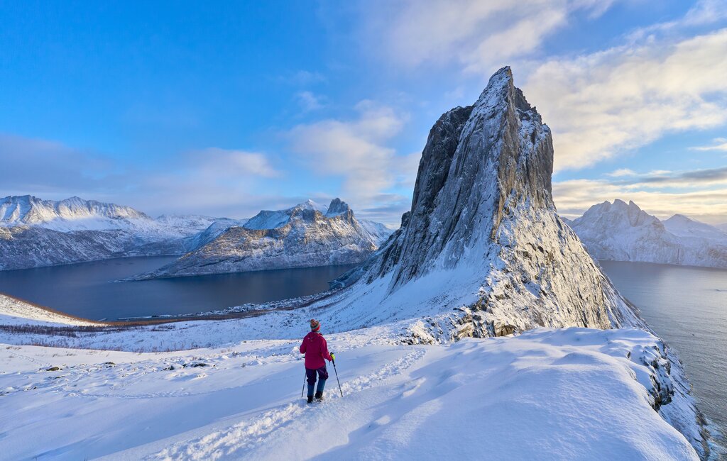 <Wir fahren nach Skaland, einem kleinen, charmanten Dorf und gehen vom Meer aus auf unseren heutigen Gipfel, den Husfjellet (632 m). Der Weg führt uns zunächst durch verschneite Wälder und weite, offene Hänge. Mit jedem Höhenmeter wird die Aussicht beeindruckender, und wir genießen die Ruhe und die Schönheit der unberührten Landschaft. Die letzten Meter zum Gipfel legen wir zu Fuß zurück. Von hier oben bietet sich ein spektakulärer Rundblick auf die umliegenden Gipfel und Fjorde von Senja.