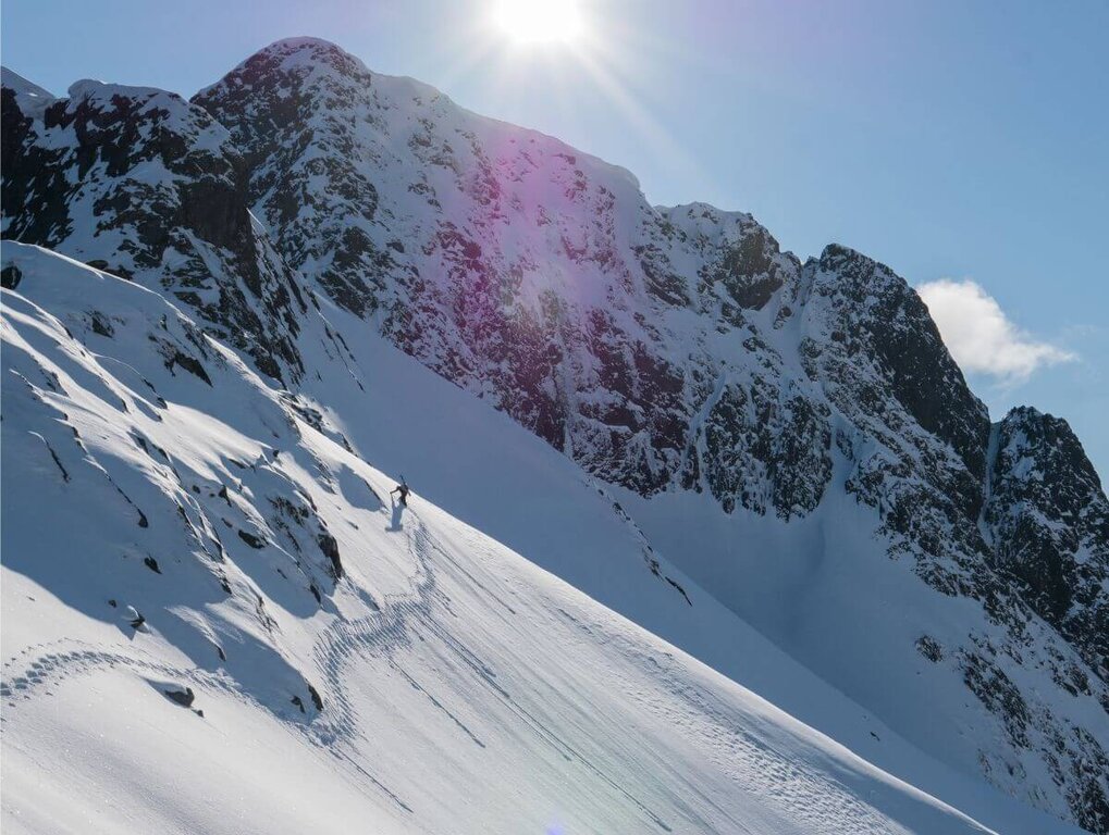 <Im Norden von Senja erwartet uns heute eine landschaftlich wunderschöne Tour auf den Gipfel Keipen (938 m). Kurz unter dem Gipfel richten wir unser Skidepot ein und gehen die letzten Meter zu Fuß. Die Abfahrt erfolgt angenehm und gleichmäßig auf der Aufstiegs-Route. Sollte das Wetter nicht mitspielen, haben wir die Option, die Tour auf den Segla zu verlegen. Diese bietet einen spektakulären Blick auf die 400 Meter senkrecht abfallende Wand bis zum Meer.
