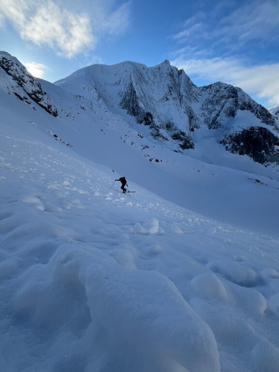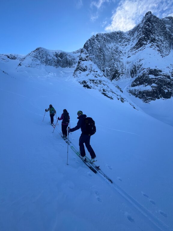 <Wir starten unsere Tourenwoche mit einer sanften Eingehtour im Krokelvtinden Tal. Die vielfältige Landschaft erlaubt uns, mehrere Flanken zu gehen. Ideal für den Start in die Woche, wo auch die Skitechnik überprüft werden kann.