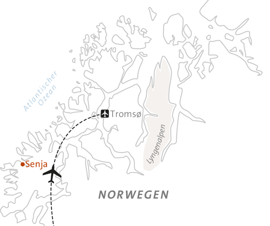Du wirst am Flughafen Evenes oder Tromsø (je nach Reisetermin) von deinem ASI Bergführer empfangen: Da mit verschiedenen Fliegern angereist wird, fällt ggf. etwas Wartezeit an. Bitte achte auf das ASI-Willkommensschild mit unserem Logo als Erkennungszeichen. Am An- und Abreisetag wird ein Sammeltransfer vom/zum Flughafen organisiert. Abfahrt am Anreisetag gegen 17h00 (späteste Ankunft am Flughafen Evenes um 16h30), Abfahrt am Abreisetag passend zu den Abflügen ab 12h00. Die Uhrzeiten können variieren, da sie den jeweiligen Ankünften angepasst werden. Die Fahrt vom/zum Flughafen dauert ca. 3,5 Stunden.