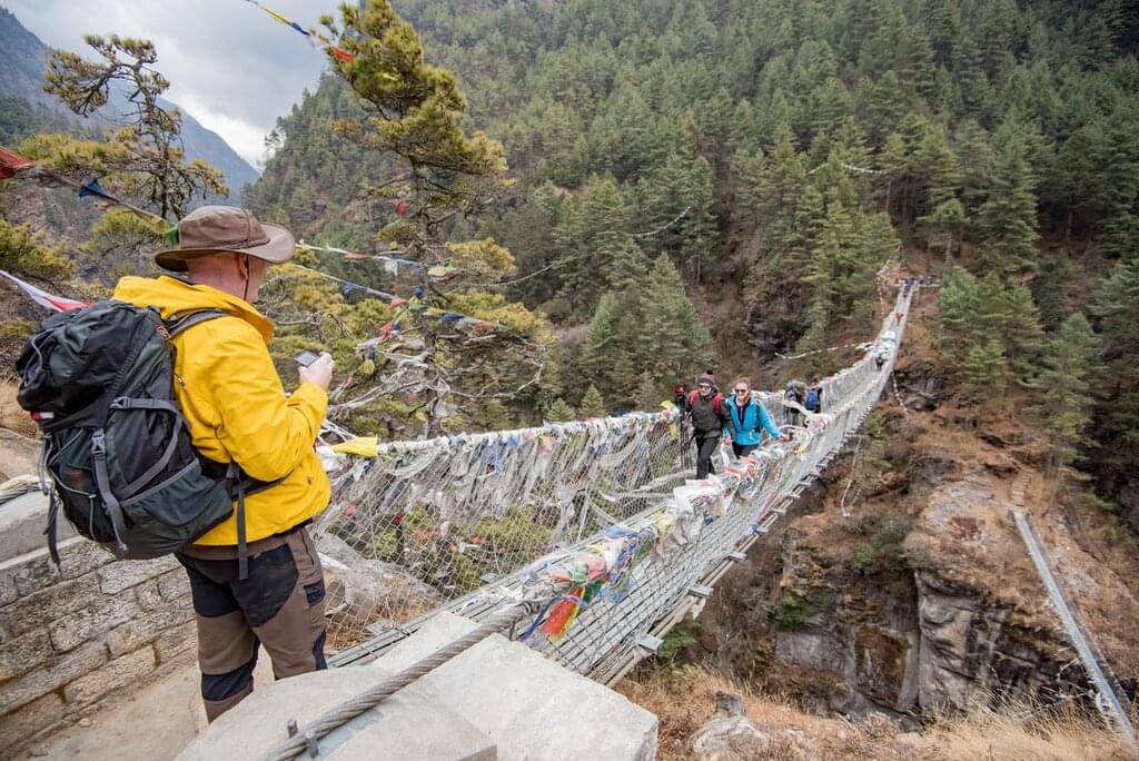 <Heute wanderst du nach Namche Bazaar, wo du zwei Nächte verbringst, um dich an die Höhe zu akklimatisieren - und vielleicht kannst du sogar einen ersten Blick auf den Everest werfen. Von Phakding aus gehst du das Tal hinauf. Der Weg, der von blauem Kiefernwald gesäumt ist, folgt dem Flusstal und ist besonders im Frühling spektakulär, wenn die Rhododendren in voller Blüte stehen. Bei Benkar überquerst du den Fluss Dudh Kosi und blickst weit über 6.000 Meter hinauf zu den schneebedeckten Gipfeln des Kusum Kanguru (6369 m) und des Thamserku (6623m). Weiter geht es nach Monjo (2835 m), ein guter Ort für eine Mittagspause. Von hier aus wird die Wanderung etwas anstrengender, denn es geht steil bergauf nach Namche Bazaar. Du betrittst den Nationalpark, überquerst den Fluss durch das Dorf Jorsale (2805m) und wanderst dann weiter flussaufwärts. Überquere die spektakuläre Hillary-Brücke und beginne den Aufstieg nach Namche Bazaar. Hol deine Kamera raus, denn an einem klaren Tag kannst du einen ersten Blick auf die Gipfel von Everest, Lhotse, Nuptse und Taweche werfen. In Namche hast du die letzte Gelegenheit, deine Ausrüstung zu überprüfen und zusätzliche Ausrüstung für die großen Höhen ab Dingboche auszuleihen.