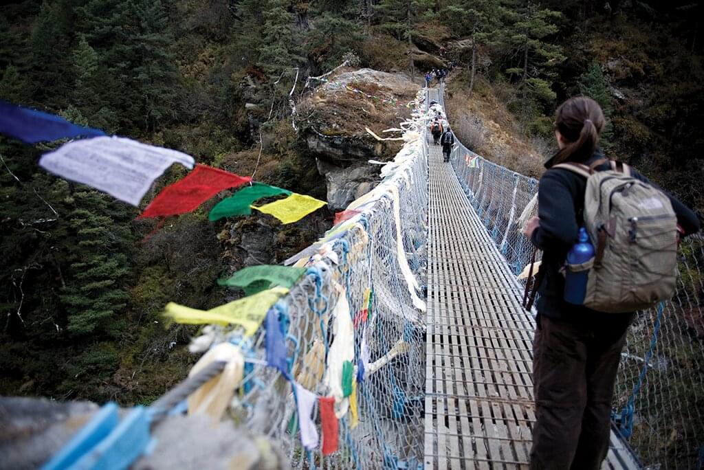 <Heute wanderst du nach Namche Bazaar, wo du zwei Nächte verbringst, um dich an die Höhe zu akklimatisieren - und vielleicht kannst du sogar einen ersten Blick auf den Everest werfen. Von Phakding aus gehst du das Tal hinauf. Der Weg, der von blauem Kiefernwald gesäumt ist, folgt dem Flusstal und ist besonders im Frühling spektakulär, wenn die Rhododendren in voller Blüte stehen. Bei Benkar überquerst du den Fluss Dudh Kosi und blickst weit über 6.000 Meter hinauf zu den schneebedeckten Gipfeln des Kusum Kanguru (6369 m) und des Thamserku (6623m). Weiter geht es nach Monjo (2835 m), ein guter Ort für eine Mittagspause. Von hier aus wird die Wanderung etwas anstrengender, denn es geht steil bergauf nach Namche Bazaar. Wir betreten den Nationalpark, überqueren den Fluss durch das Dorf Jorsale (2805m) und wandern dann weiter flussaufwärts. Überquere die spektakuläre Hillary-Brücke und beginne den Aufstieg nach Namche Bazaar. Hol deine Kamera raus, denn an einem klaren Tag kannst du einen ersten Blick auf die Gipfel von Everest, Lhotse, Nuptse und Taweche werfen. In Namche hast du die letzte Gelegenheit, deine Ausrüstung zu überprüfen und zusätzliche Ausrüstung für die großen Höhen ab Dingboche auszuleihen.