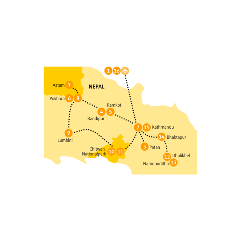 <Deine Reiseleitung erwartet dich nach der Landung voller Vorfreude am Flughafen, um dir das Land zu zeigen. Nach einem kurzen Stopp in deinem Hotel kannst du deine Mitreisenden bei einem gemeinsamen Mittagessen kennenlernen und einen kurzen Spaziergang durch die quirlige Altstadt unternehmen. Anschließend fährst du zum »Pabitra Sozialhaus«, das von der Chamäleon Stiftung unterstützt wird. Die Bewohnerinnen und Bewohner freuen sich schon auf deinen Besuch. Zum Abschluss dieses ereignisreichen ersten Tages in Nepal genießt du heute ein typisch nepalesisches Essen in einem besonders familiären Kreis.
