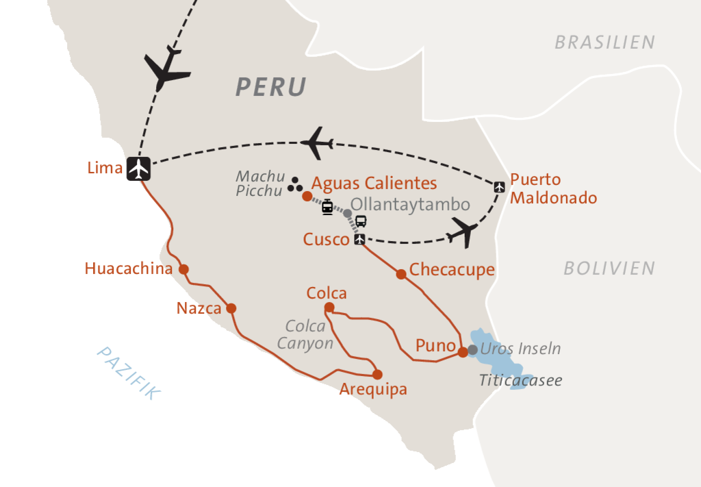 Erlebe die Vielfalt Perus von der Küste bis zum Amazonas: Lima mit seinem kolonialen Flair, die schneebedeckten Anden und das bunte Spektakel des Regenbogenbergs Palccoyo, das weite Hochland des Altiplano, das geheimnisvolle Colca-Tal mit seinen majestätischen Kondoren, die legendären Ruinen von Machu Picchu und der Inka-Trail sowie die unberührte Tier- und Pflanzenwelt des Amazonas. Eine Reise voller Farben, Kulturen, Abenteuer und unvergesslicher Naturmomente.