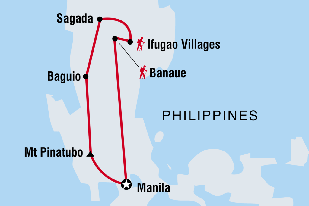 <It's an early start today as you leave Manila by private van and travel to Banaue, settling in for a 9-10 hour drive – get out your book, get to know your fellow travellers, listen to your new favourite album, or watch out the window for your first taste of the Philippines outside of the metropolis. The isolated and quaint town of Banaue features markets and a local museum, but the main drawcard of the area is the rice terraces. Referred to by some as an ‘Eighth Wonder of the World’, the stunning Banaue rice terraces were constructed over 2,000 years ago by the native Ifugao people. Still in use today, these remarkable rice terraces stretch like stepping stones towards the sky, some reaching an altitude of 1,500 metres (4,920 feet). The best way to view the terraces is from the nearby viewpoint, where the lush green steps unfold below and sunlight reflects off the surface of the pools. You’ll get more time on Day 6 to really appreciate this wonderful view. Notes: Tonight you’ll stay in a simple hotel with twin share rooms, with private bathrooms with hot and cold water showers. -
