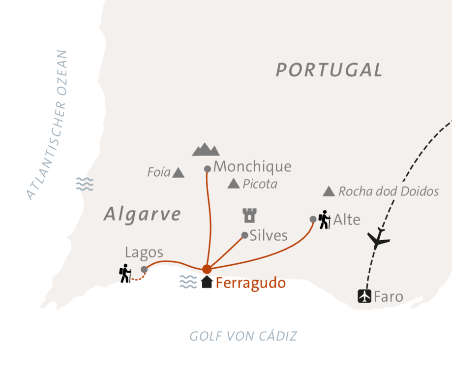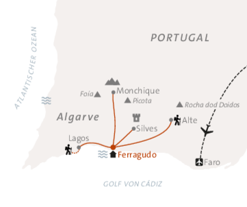 <Wir starten unsere Wanderung in der Serra do Caldeirão, wo Olivenhaine und Mandelplantagen das steinige Bergland prägen. Vom 456 m hohen Rocha dos Soídos reicht der Blick weit über die schöne Landschaft und im Bergdorf Alte erwartet uns ein Mittagessen mit regionalen Spezialitäten. Wir bummeln durch blumengeschmückte Gassen, genießen den Duft von Orangenblüten und lauschen dem Plätschern des Baches. Am Nachmittag tauchen wir in die Geschichte von Silves ein: Einst unter den Mauren Hauptstadt der Algarve, zeugt die mächtige Burg noch heute eindrucksvoll von dieser Zeit.