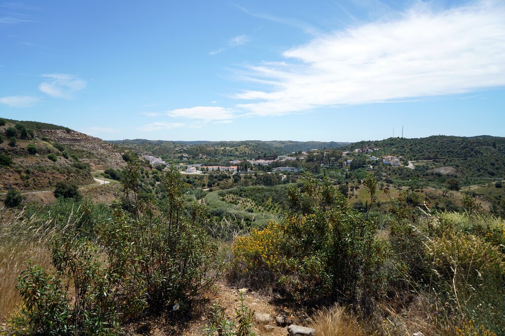 <Wir fahren in die Gegend von Alte: in einem kleinen Weiler beginnen wir unsere Wanderung, die uns auf den Tafelberg Rocha da Pena führt. Zunächst queren wir aber ein Tal, es geht vorbei an Kulturlandschaft und einzelnen Gehöften, bevor der Weg ansteigt und wir schließlich das Gipfelplateau erreichen. Was für ein herrlicher Ausblick auf die Küste und die Serra de Mú! Nach der Wanderung besuchen wir das Dörfchen Alte.