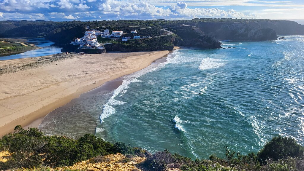 <Vom Strand von Odeceixe starten wir entlang eines besonders schönen Abschnitts des Fischerpfads und wandern Richtung Süden entlang der Küste. Bald lassen wir das Meer hinter uns und tauchen in die sanfte Hügellandschaft des Hinterlands ein, bis wir Maria Vinagre erreichen. Auf dem Rückweg nach Odeceixe passieren wir Farmland und entdecken das ländliche Leben der Region. Wir halten an der alten, liebevoll restaurierten Mühle von Odeceixe und genießen den Ausblick über die Dächer und den Fluss Seixe.