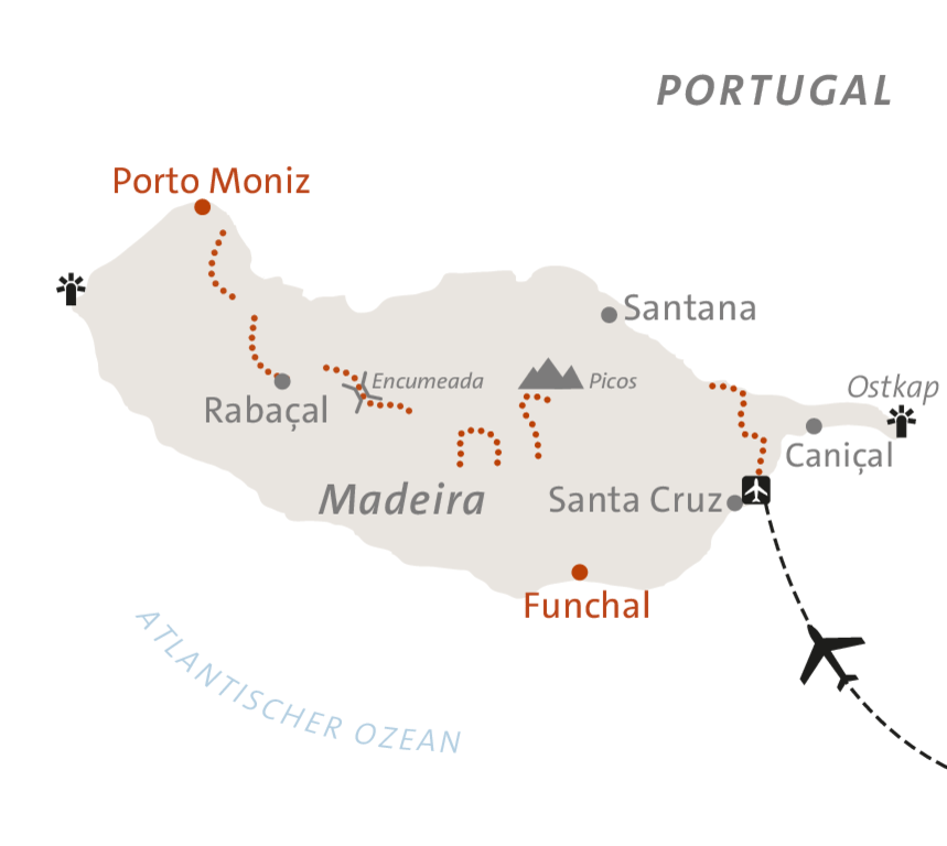 <Nach dem Frühstück treffen wir unseren Wanderführer um 8:30 Uhr an der Hotelrezeption – bitte bereits in Wanderausrüstung erscheinen. Gemeinsam starten wir in unser Madeira-Abenteuer. Unser Bus bringt uns nach Machico, der ältesten Siedlung Madeiras. Vom goldenen Strand von Machico steigen wir hinauf zum Pico do Facho, einem Aussichtspunkt mit fantastischem Blick bis zum Ostkap. Weiter geht es durch terrassierte Obst- und Gemüsegärten stetig bergauf, bis wir die wilde Nordküste erreichen. Am Aussichtspunkt Boca do Risco fallen die Klippen dramatisch ins Meer ab. Im Norden erkennen wir die Nachbarinsel Porto Santo, tief unter uns brandet der Atlantik an die Felsen. Auf schmalen Pfaden wandern wir in ständigem Auf und Ab entlang der steilen Küste und genießen dabei spektakuläre Weitblicke. Die Tour endet oberhalb von Porto da Cruz, beim markanten Adlerfelsen. Bei einem gemütlichen Mittagessen in einem lokalen Restaurant stärken wir uns für die kommenden Wandertage.