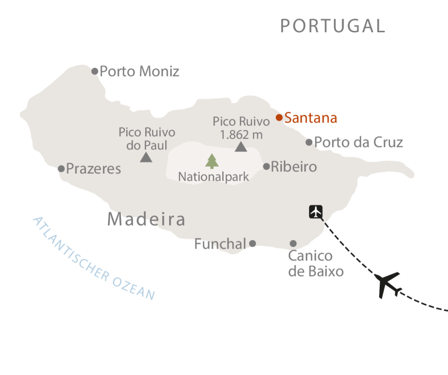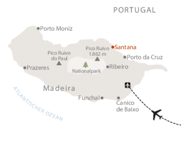 Madeira zu bereisen ist, als würde man in eine andere Welt eintauchen: Weihnachtssterne wachsen hier zu mannshohen Sträuchern, Baumheiden ragen wie Tannen in den Himmel, und Lorbeerbäume werden zu uralten Riesen. Doch nicht nur die exotische Pflanzenwelt beeindruckt – auch Madeiras Landschaft ist voller Kontraste. Spektakuläre Steilküsten und idyllische Täler, schroffe Gipfel und sattgrüne Wälder wechseln einander ab und ziehen uns sofort in ihren Bann. Die Menschen auf Madeira sind lebensfroh, herzlich und stolz auf ihre Insel. Auf dem fruchtbaren Eiland gedeiht fast alles: Von tropischen Früchten über Wein bis hin zu den berühmten Blumen – Madeira macht seinem Beinamen Blumeninsel alle Ehre. Erlebe Madeira aktiv, ohne auf Komfort zu verzichten – du übernachtest in der 4*-Quinta do Furão, die spektakulär auf einer Klippe über dem Atlantik gelegen ist.