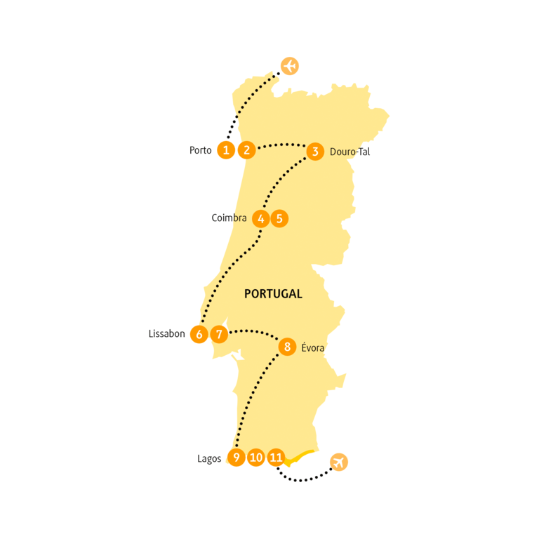 Bitte halte dich um 9 Uhr in der Lobby bereit. Du triffst deine Reiseleitung und startest die Erlebnis-Reise durch Portugal.