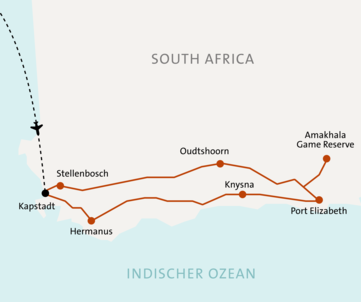 Auf dieser Reise erkunden wir die schönsten Landschaften am Kap. Unsere Route führt über die malerische Garden Route in die Kapregion – eines der schönsten Wandergebiete Südafrikas. Wir wandern in der Kulisse lieblicher Weinberge, spektakulärer Gebirge, wildromantischer Schluchten und herrlicher Küstenlandschaften mit Blick auf den blauen Ozean, in dem sich immer wieder Wale und Delfine beobachten lassen. Im privaten Wildreservat Amakhala erwarten uns unvergessliche Begegnungen mit den “Big Five”. Unsere Reise endet in Kapstadt – eine der schönsten Städte der Welt.