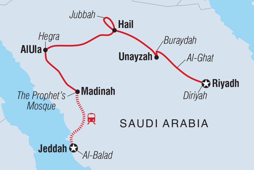 Auf dieser neuntägigen Reise von Riad nach Jeddah besuchst du einige der berühmtesten Wahrzeichen Saudi-Arabiens. Schlendere über den Souk Al Zal, den farbenfrohen Markt in Riads Stadtteil Deera, fahre mit der Metro von Riad und beobachte, wie der Elefantenfelsen bei Sonnenuntergang rot leuchtet. Besuche einen Emirats-Palast aus dem 19. Jahrhundert in Al-Ghat, nimm ein traditionelles Najdi-Mittagessen ein, erkunde die antike Felskunst in Hegra und besuche die Quba-Moschee in Madinah. Iss auf Schritt und Tritt wie ein Einheimischer, verbringe zwei Nächte beim Zelten im Herzen von Al-Ula und erfahre unterwegs mehr über die reiche Geschichte der Region.